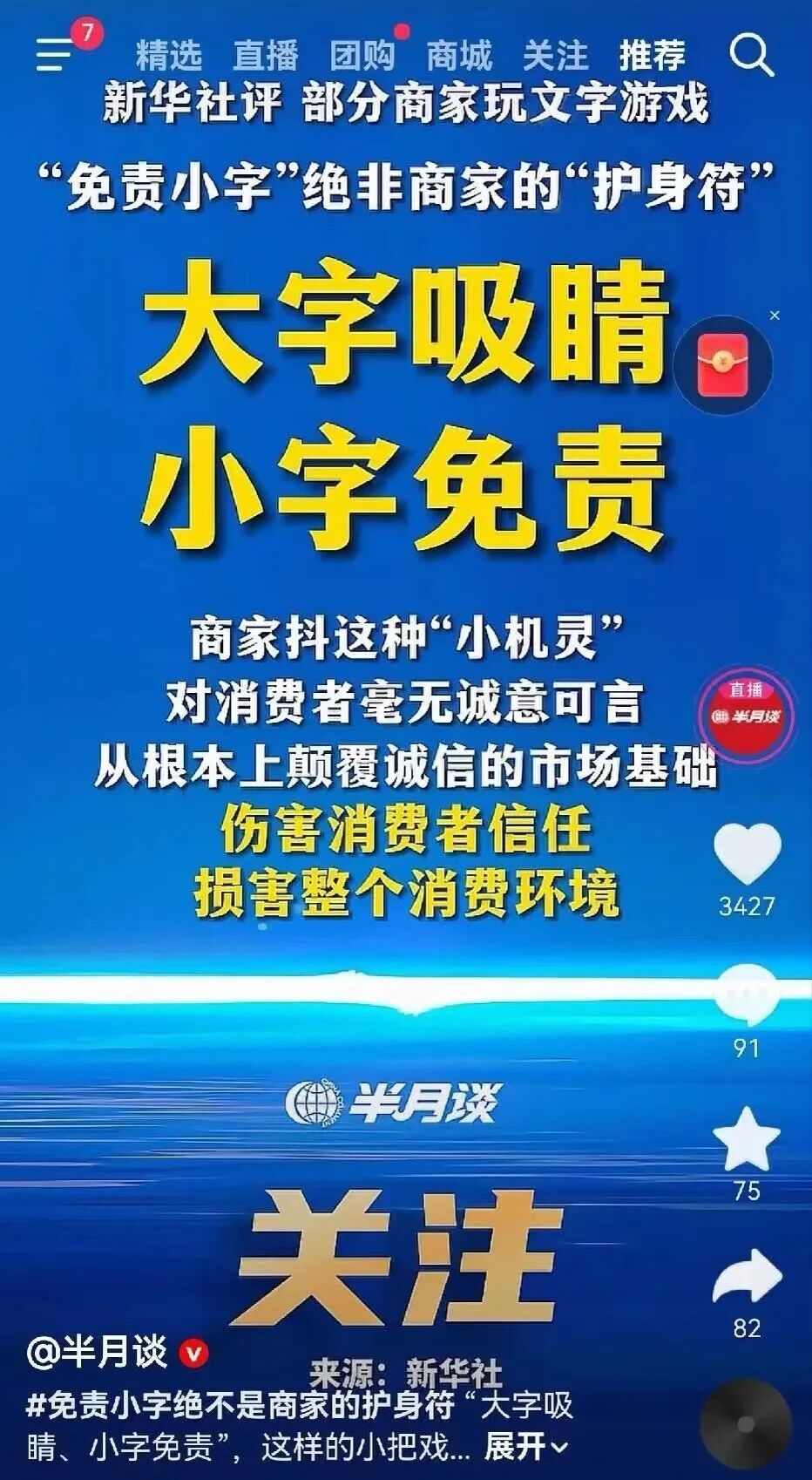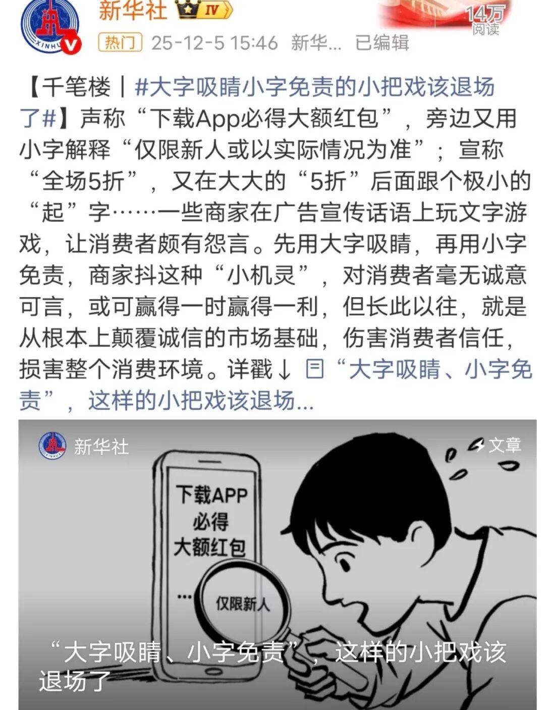 近日,新华社发表评论《“大字吸睛、小字免责”,这样的小把戏该退场了》,直接把矛头指向这种营销邪修。