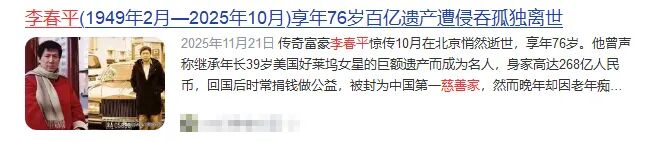 还有前不久去世的慈善家李春平,他拥有百亿资产,光是捐款就捐了6.3亿,平均每天要捐出7万元,被称为中国第一慈善家。