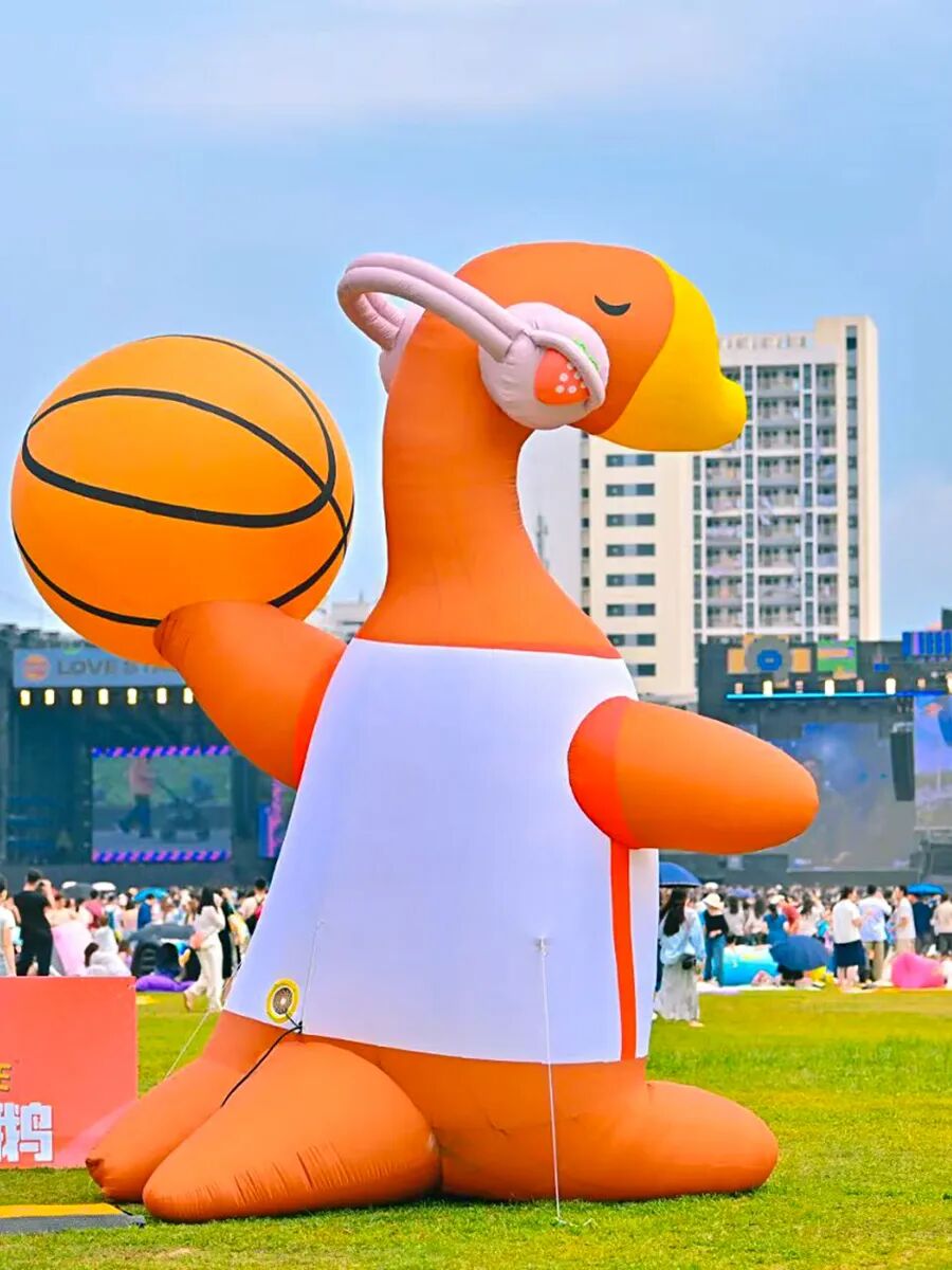 另一边还摆着摊,摊位最耀眼的地方是一堆挂着的烧鹅,有人好像打包外卖的服务员一样在摊位站着,走近了才发现居然都是酷似烧鹅的玩偶——正是刚才陪你蹦迪的那个品牌。