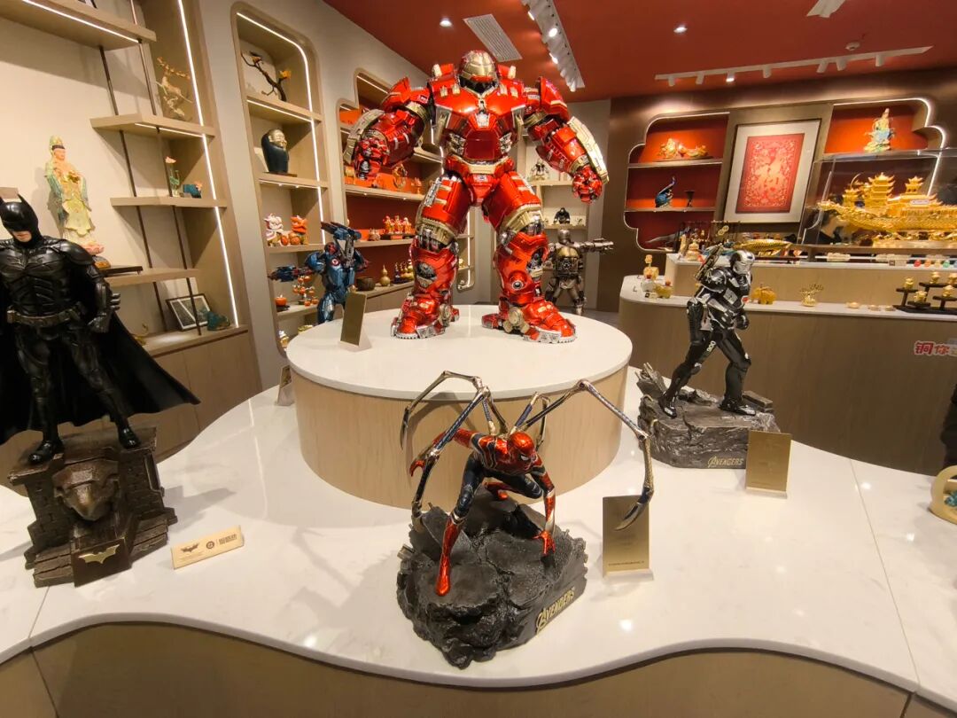 铜师傅主要售卖的就是铜制工艺品。盐财经记者在深圳线下门店里注意到,铜师傅的展柜陈列的,既有 “大圣传奇”、变形金刚等热门IP联名款,也有铜葫芦、财神雕塑、“聚宝盆”等经典款铜制品。
