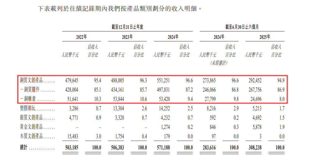 铜师傅招股书显示,近三年多来,铜质文创产品始终贡献着近九成五的营收,塑胶潮玩、银质文创、黄金文创等新业务合计占比不足5%。