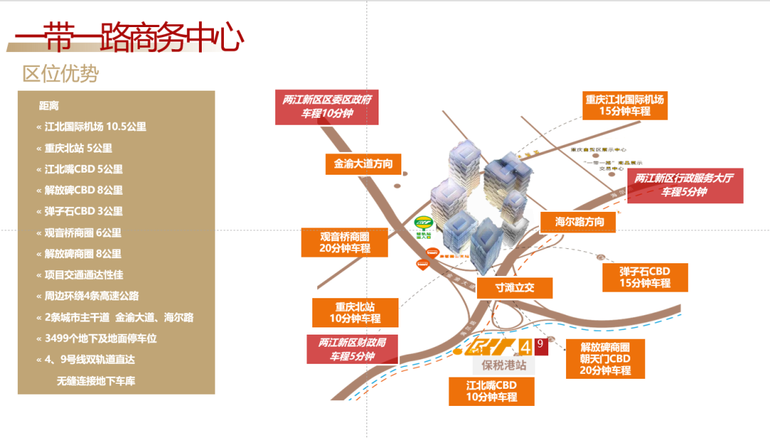 重庆“一带一路”商务中心位于寸滩国际新城保税经济区,距江北国际机场十几分钟车程,与重庆火车北站及两大中央商务区共同构筑了“5公里黄金经济圈”,享有卓越的交通及区位优势。
