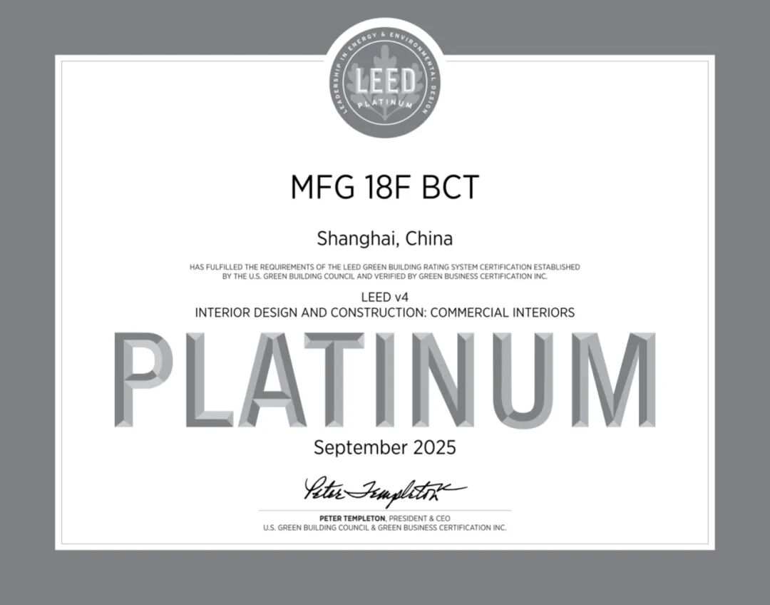 MFG滨港商业中心位于LEED认证的上海虹口滨港商业中心这座高性能办公楼内,在此基础上项目再次取得认可,使整体办公环境在健康、可持续表现上更进一步。很高兴看到MFG与崇邦联手打造现代商务办公空间新枢纽,在可持续道路上,众行者远。如今,可持续浪潮正由建筑延伸至更多室内空间,MFG对ESG理念的深刻理解也落实在实践中。通过“统一规划、批量装修、长期复用”的模式,MFG有效回应了行业普遍关注的建筑隐含碳挑战,为办公生态的可持续发展提供了可量化、可复制的范本,同时也提升了用户体验与写字楼运营服务的品质。