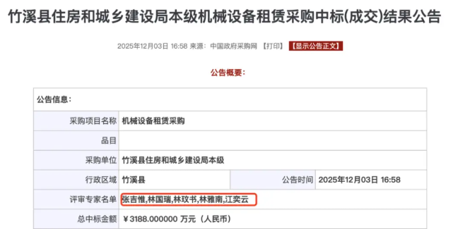 12月3日,政府采购网上,挂出了一份竹溪县住建局的一则中标公告,表面上的内容,都很规范工整,采购网上每天都有数百上千份这样的文件,没啥稀奇的。但是有网友意外发现,其中评审小组成员名单,似乎有点眼熟,好像在哪里见过。