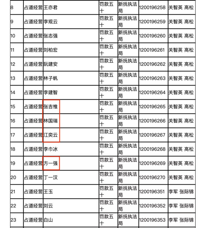 因为五人组的出场率过高,大家的关注点都在他们身上,很多人忽略了,这次假名单风波的起点,其实是“众多明星违规占道经营”,有网友意外发现,一则来自2019年的占道经营处罚名单上,居然出现了大量的艺人名字,如李现、邓伦、金晨、孙俪、胡歌等等。
