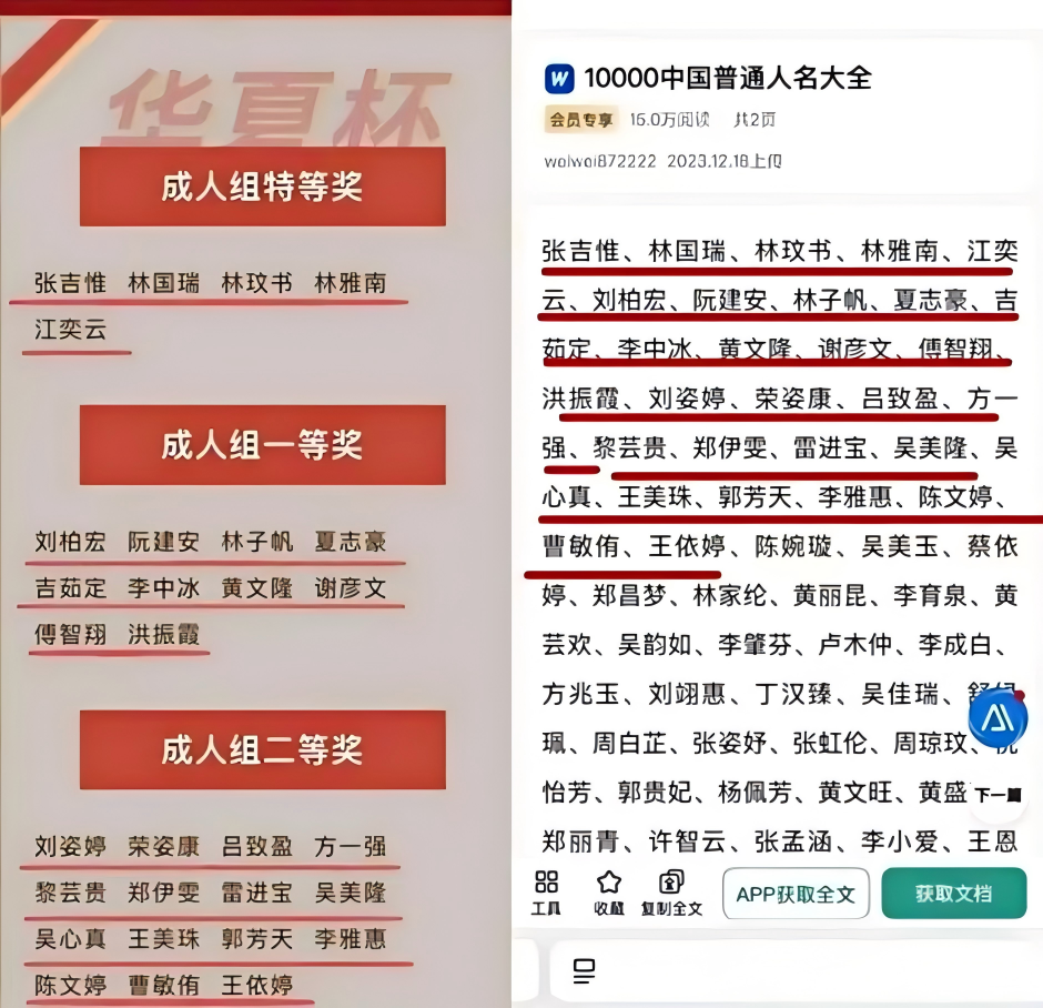 因为上面有规定有要求,必须公布名单,但收集和输入大量真实人名,是非常繁重的工作,或者压根就不存在真人,负责编辑公告的人索性随便瞎编 ————— 当然,靠自己一个个瞎编名字,工作量也不少,要死很多脑细胞,于是就去网上搜 ———— 大家最常用的百度搜索引擎,在结果排名中,往往会把自家的产品放在最前面,于是编辑者自然而然进了百度文库 ————— 至于为什么在庞大的人名库里选这五人组、选那几十个熟面孔,也很好解释,因为五人组最靠前,而且文档后面的内容是需要充VIP才能看的,这属于自费上班了,傻子才干呢!
