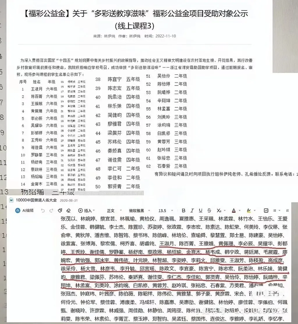 媒体扒出,杭州师范大学2022年发布的“福彩公益金项目受助对象公示”,名单和《人名大全》中的姓名高度重合,只不过,他们没有用最前面的张吉惟,而是截取了更加靠后的几十个名字。这可是公益慈善项目,而且用着福彩的钱,本来应该把每个受助人的名字都写得清清楚楚,让大家知道钱的去向,最后全搞成了赛博生命。