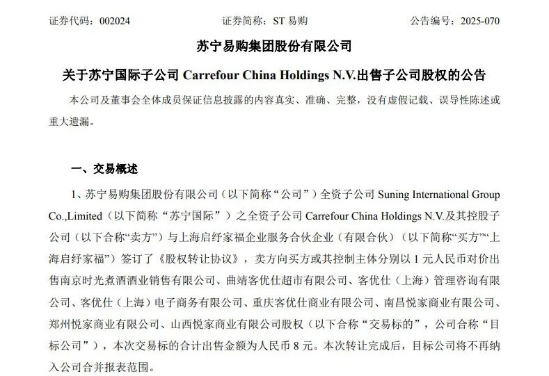 此次被出售的8家公司,延续了苏宁易购处置原家乐福中国资产的进程。2019年,苏宁易购全资子公司苏宁国际曾出资48亿元收购荷兰家乐福中国控股有限公司80%的股份,成为家乐福中国控股股东。