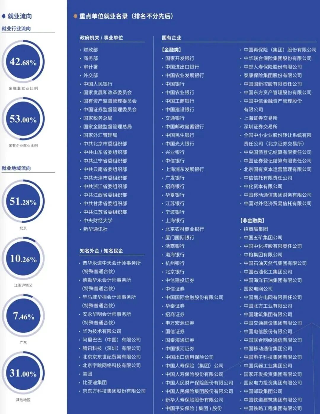 根据2024年央财毕业生就业去向数据,就业单位性质以国企为主,占整体比例的53%,不少毕业生进入“四大行”及商业银行;