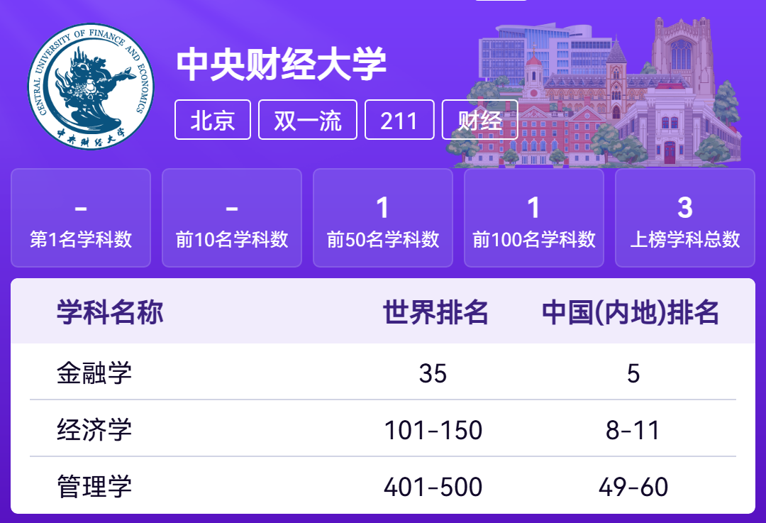 这“就业+深造”双高格局的背后,是学校以优势学科为引领,构建的“大金融学科体系”与复合型人才培养生态。根据教育部第四轮学科评估结果,应用经济学为A+,与北京大学、中国人民大学并驾齐驱。在软科发布的世界一流学科排名中,金融学进入世界前50名,经济学进入世界前200名,两个学科均处于全球较优区间,具有着非一般的世界学术影响力。