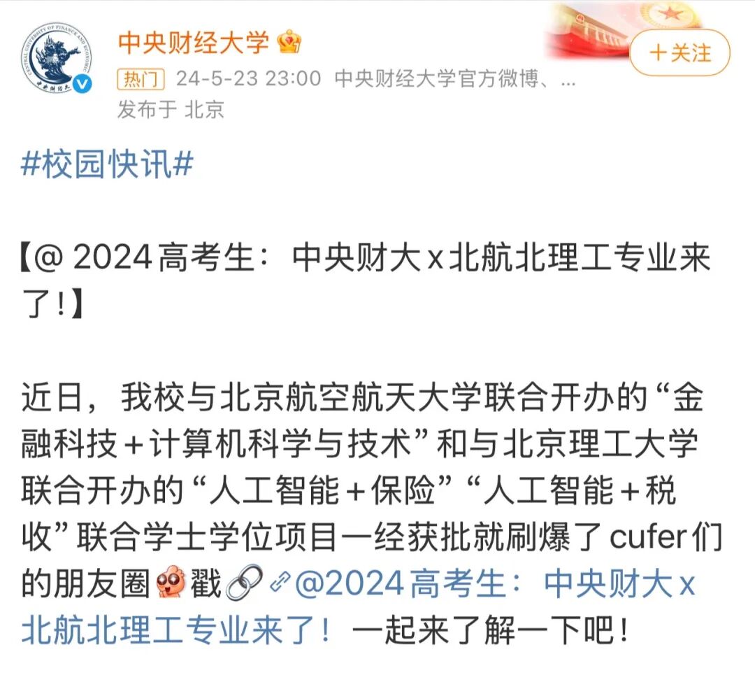 如与北京航空航天大学成立“金融科技+计算机科学与技术”,与北京理工大学成立“人工智能+税收”,与北京外国语大学成立“金融学+英语”等学士学位人才培养项目,探索跨学校、跨学科的培养模式,培养拔尖跨界人才。