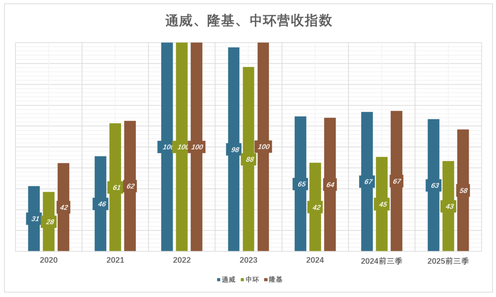 2025年前三季,形势仍未好转,通威、隆基、中环营收指数(以2022年前三季为基准)分别为63.3、58.5、43.3。