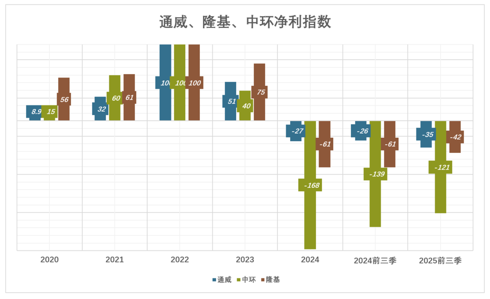 2024年至暗时期,通威、隆基、中环利润指数分别为-26.6、-60.7、-168.1。