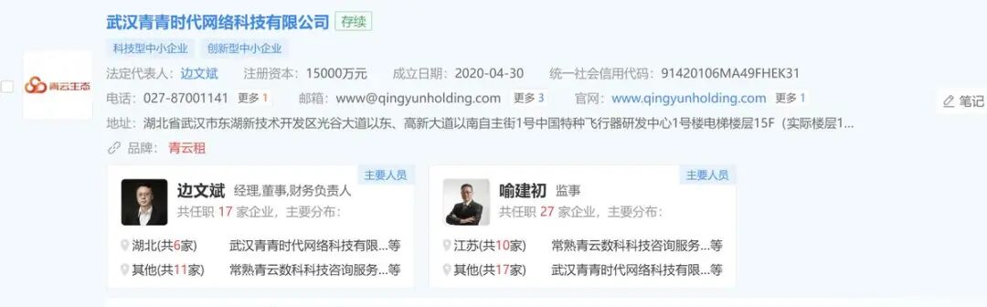 根据企查查公开信息,武汉青青时代网络科技有限公司在2020年4月成立时,注册资本为1.5亿元,法定代表人为边文斌。