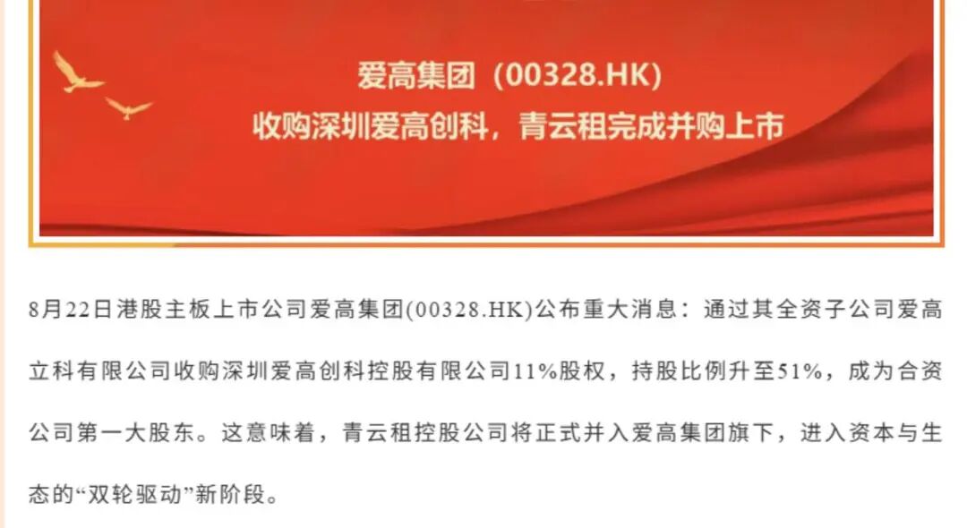 更值得玩味的是,一个月后的8月22日,“青云租”正式由爱高集团完成控股收购。