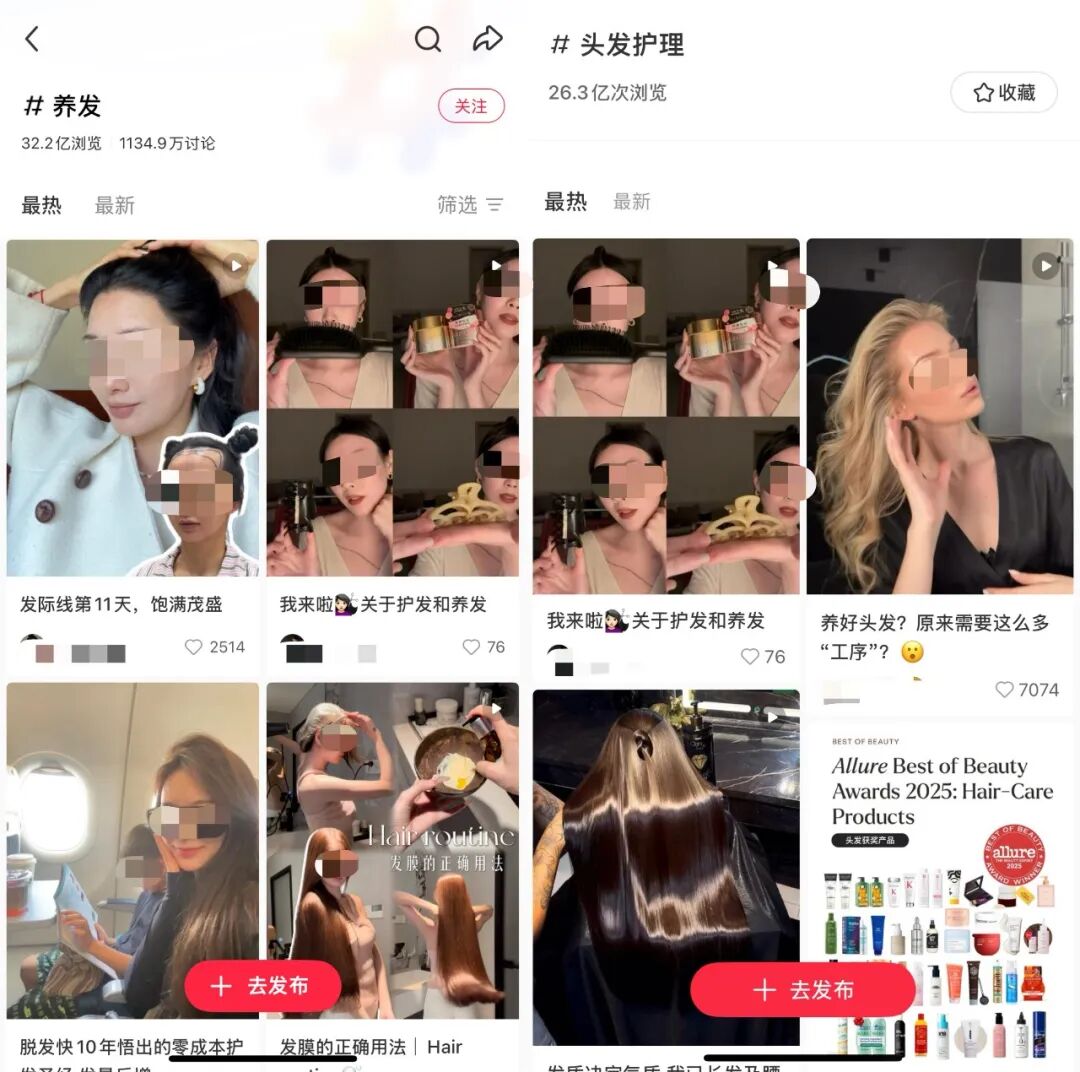 对于这类人群而言,“发际线保卫战”已迫在眉睫。小红书平台数据显示,#养发 话题浏览量超32亿,#头发护理 话题浏览量超26亿。焦虑的年轻人们,选择在社交媒体上“寻医问药”。