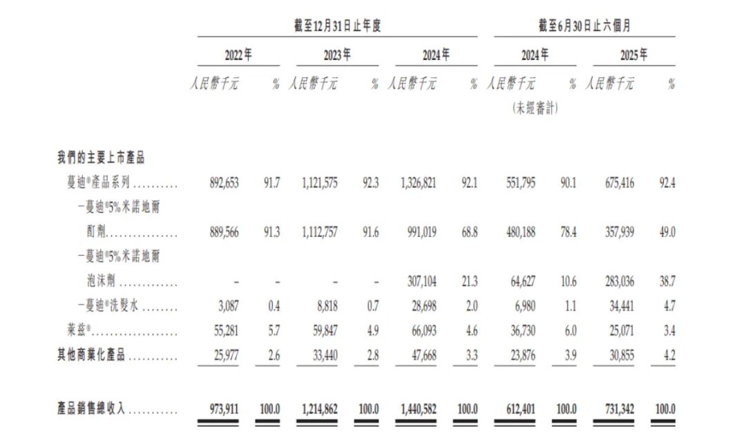 通过资本加持和持续研发,蔓迪逐步构建起护城河。2018年,公司通过磷酸缓冲液技术解决“常温条件稳定储存”的行业难题;2024年,推出中国首个且唯一获批的米诺地尔泡沫剂;2025年,推出蔓迪防脱发洗发水,上市首六个月销量超过50万瓶。