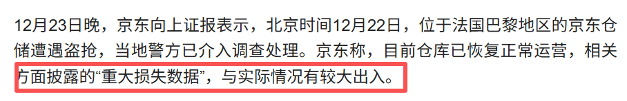 京东随后回应称,被盗仓库已恢复正常运营,并表示部分法国媒体所称“重大损失”与实际情况存在较大出入。