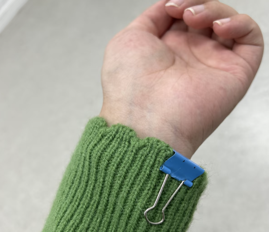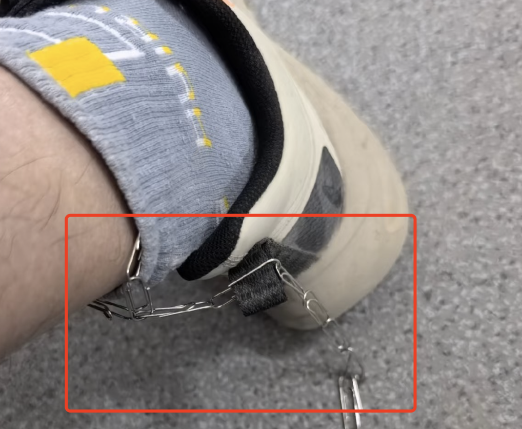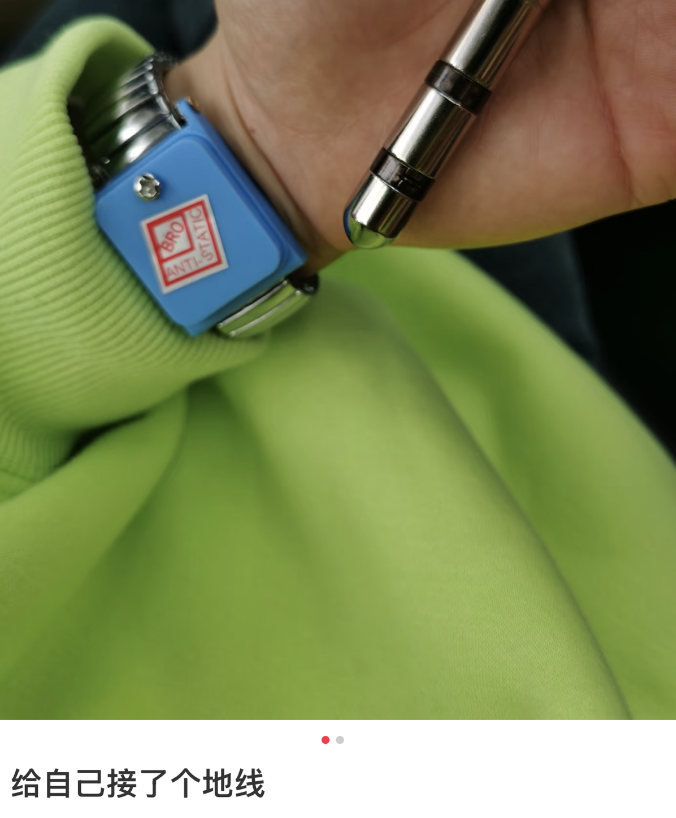 有人在工位上用金属夹别在袖口给自己导电。