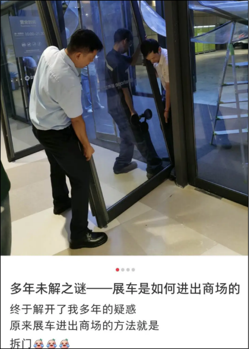 为了配合车企,有的商场连夜把门给拆了。