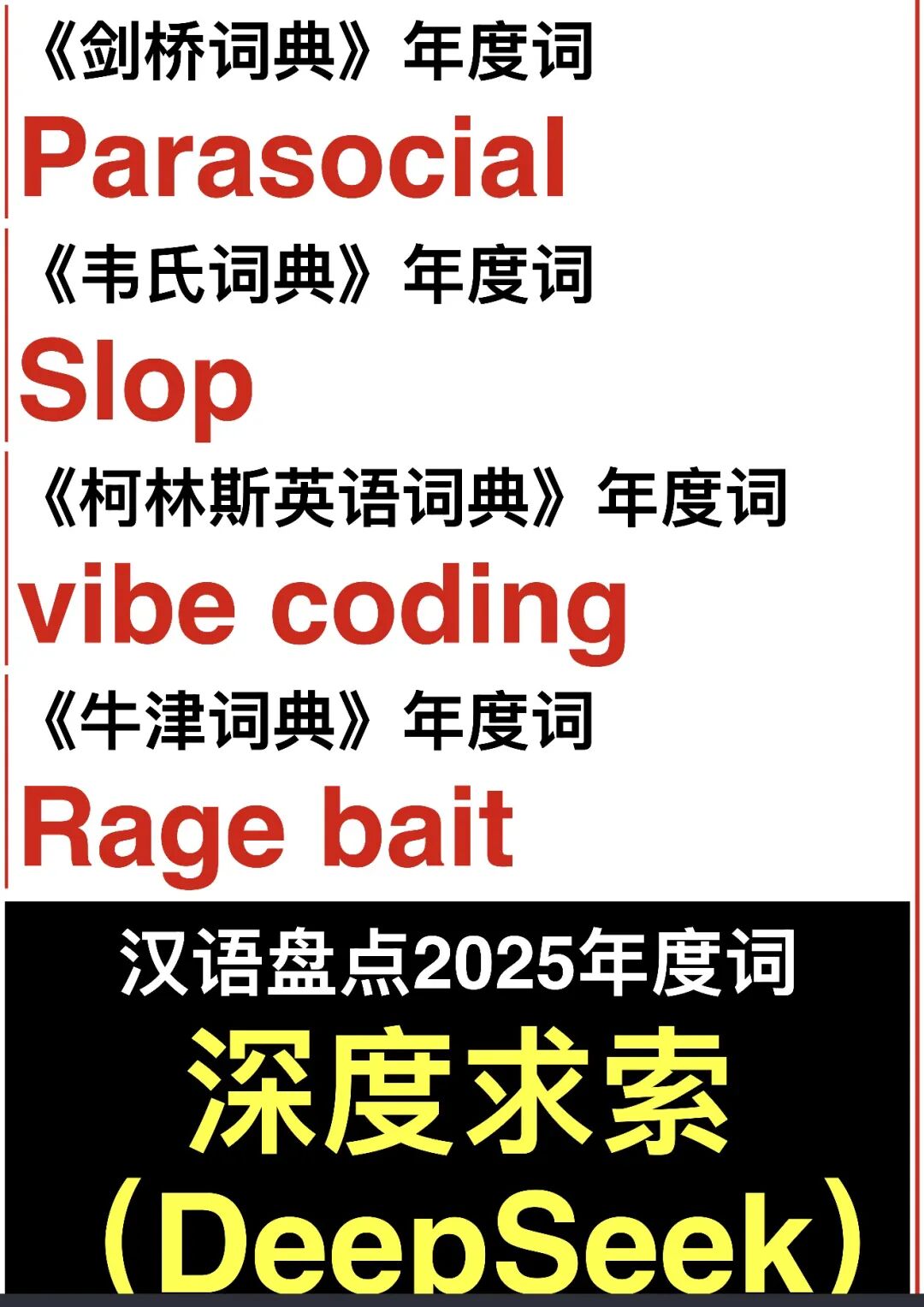 “深度求索”象征着人类在技术浪潮中仍试图保有方向感;“类似亲密”揭示了情感需求在虚拟世界中的迁移;“愤怒诱饵”暴露了情绪被系统性收割的现实;“氛围编程”展示了生产力解放的另一种可能;而“AI垃圾”则提醒我们,效率失控同样会侵蚀意义。