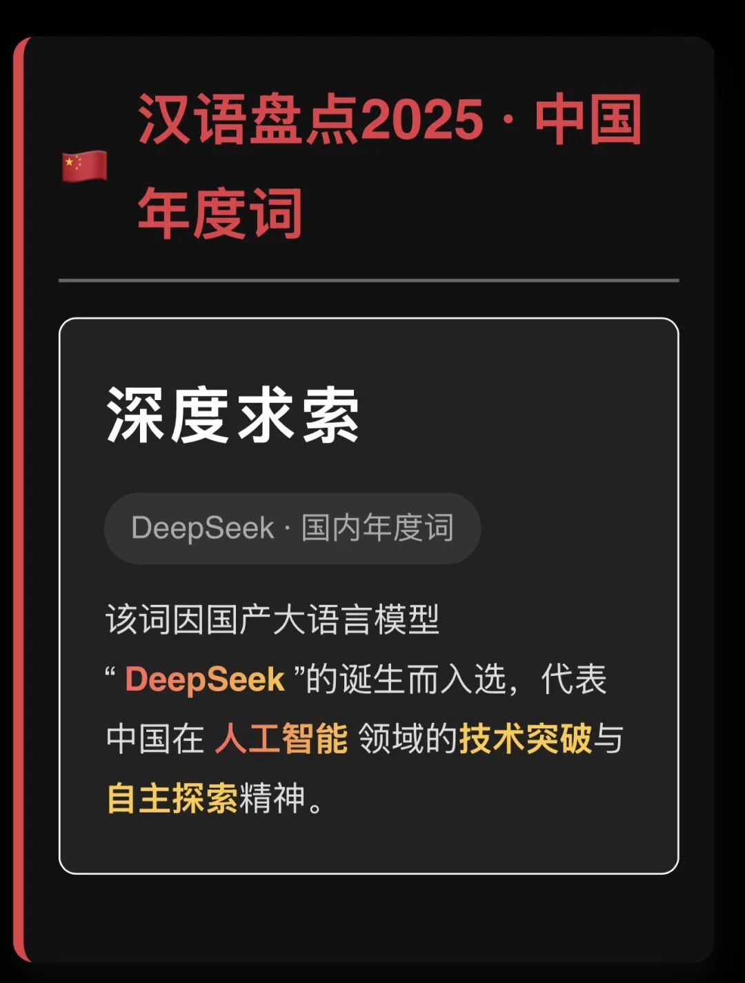“深度求索”最初只是一个技术名词,源于国产大语言模型 DeepSeek。但它最终能够成为年度国内词,显然不仅因为参数规模或训练成本。