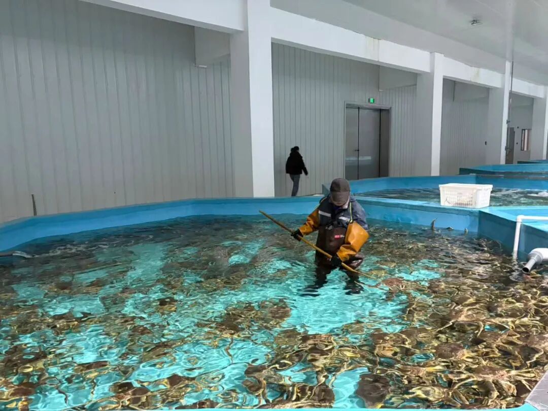 负责园区运营的这两年,他也变成了帝王蟹专家。帝王蟹是好斗的品种,它们经常会在海底相互打斗,导致断腿、缺腿。为此,暂养中心每天安排专人,穿着水鞋,带着蟹钩,在暂居池里寻找缺腿或奄奄一息的蟹,及时捞出它们,避免进一步损失。