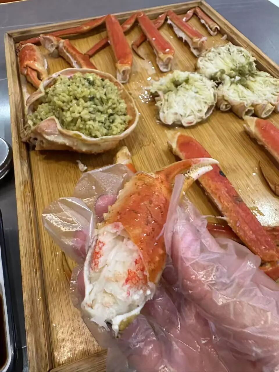这时,再配上一截粗大饱满、肉质泛红、口感鲜香的蟹腿,蘸上酱油、芥末食用,脑海中顿时便冒出珲春海鲜街头的标语——“海鲜三国汇,东方最美味”。