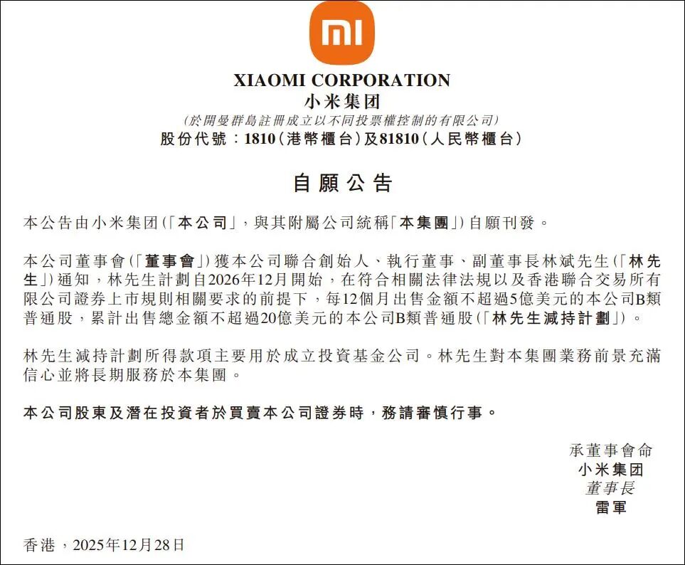 就在12月28日,根据公告,小米联合创始人林斌计划自2026年12月起,在符合监管与港交所规则的前提下,每12个月出售不超过5亿美元的小米B类普通股,累计减持金额不超过20亿美元。