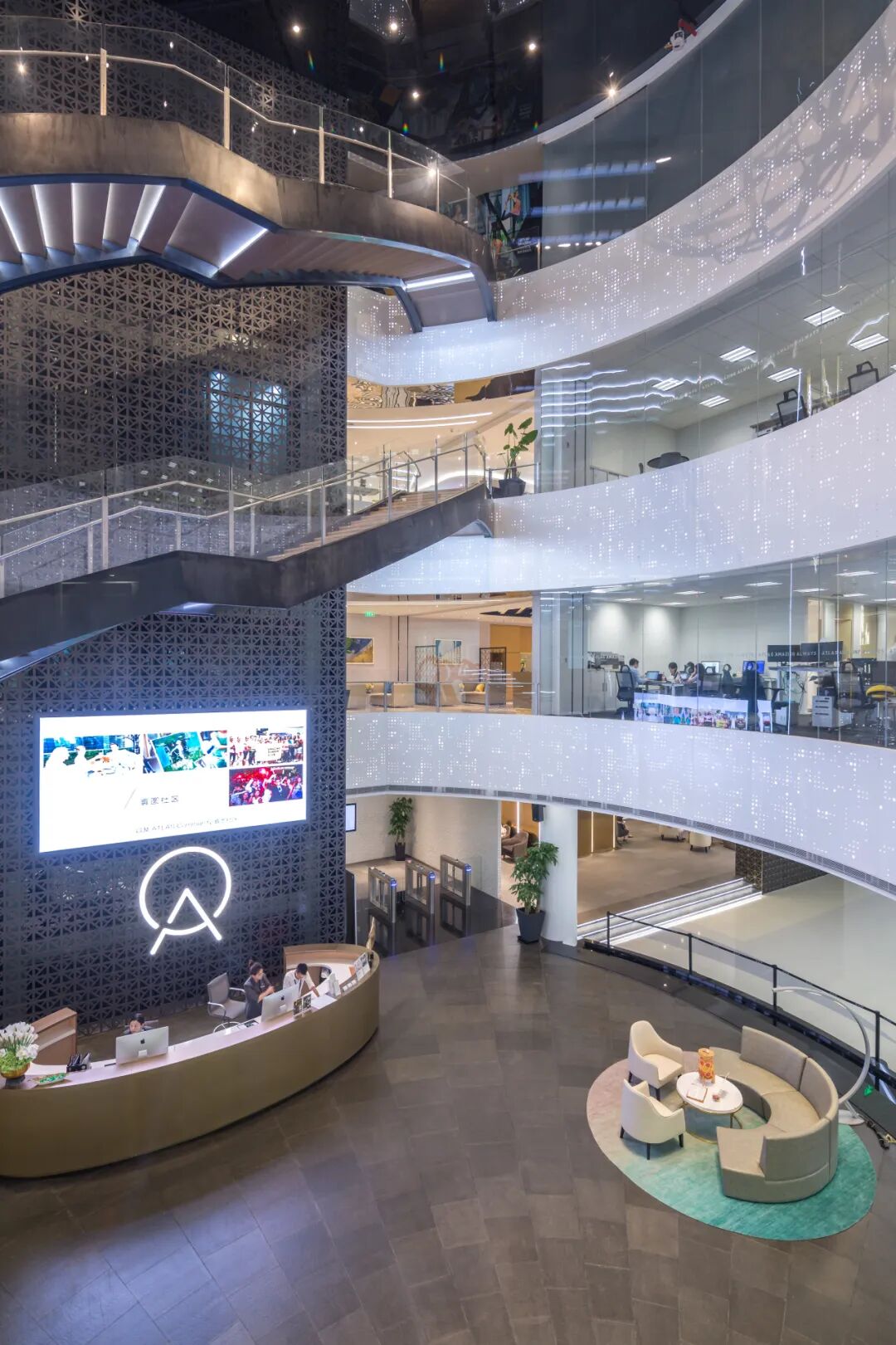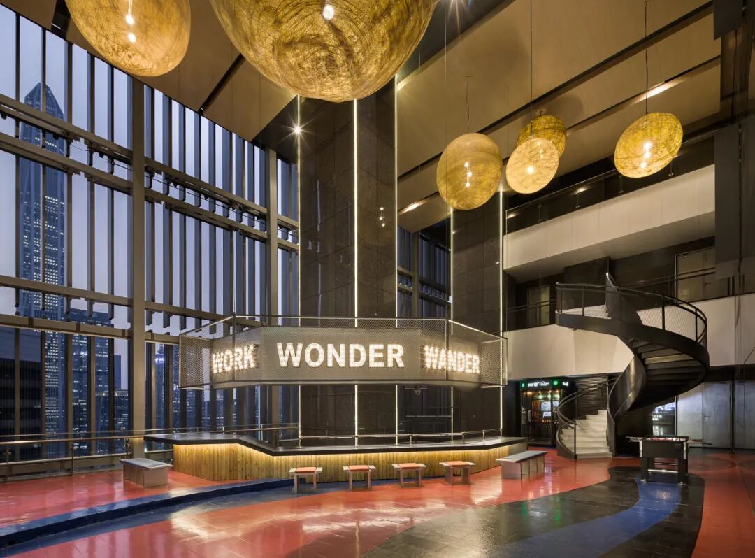 以 ATLAS 寰图·雅居乐国际广场为例,将原扶手电梯改造为回旋式的空中楼梯,大堂采用挑高的中空设计,成功解决了综合体进深宽、无采光的改造难题,极大地提升了办公舒适度。