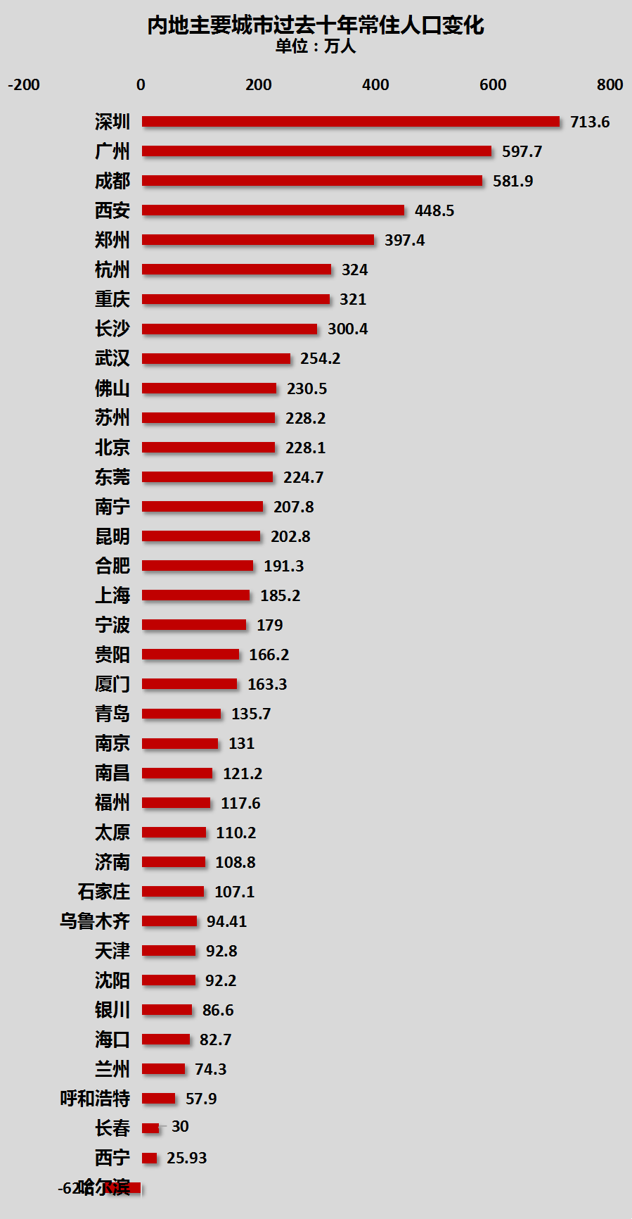 七普数据显示,深圳常住人口十年增量位居全国第一,十年间深圳常住人口增加了713.6万人。