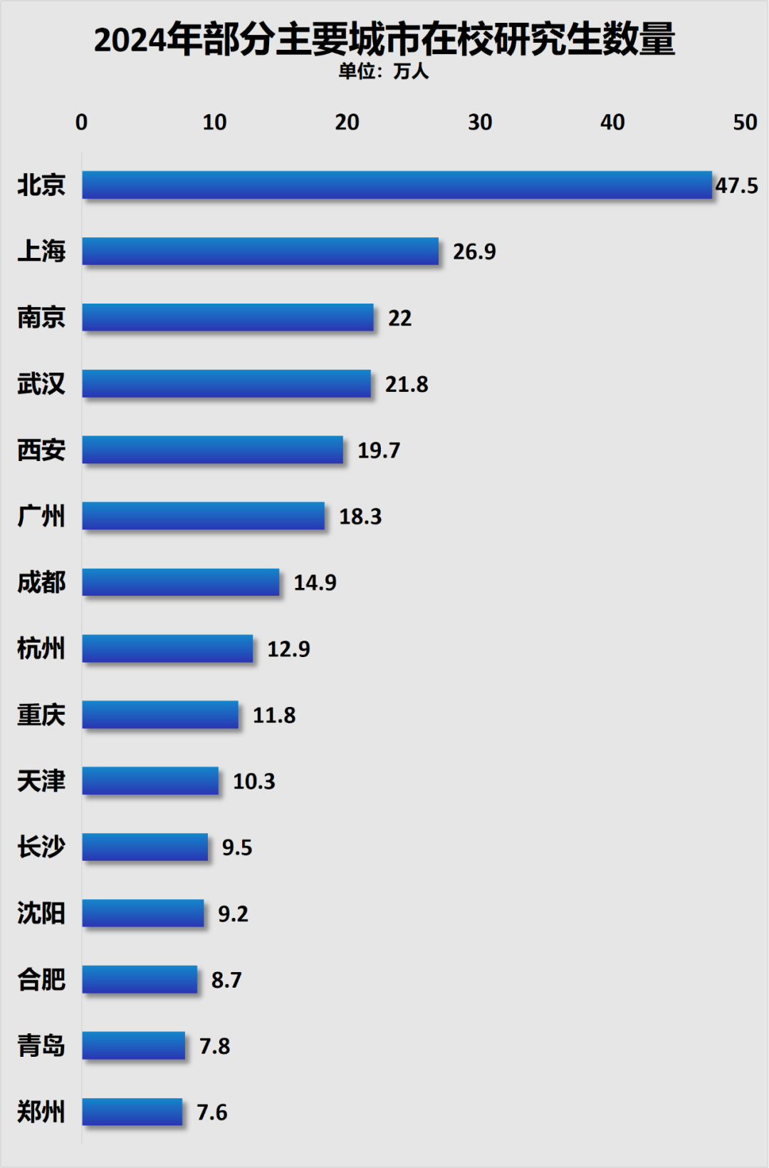 2024年年末,北京在校研究生数量高达47.5万人,位居全国第一,且断崖式领先。