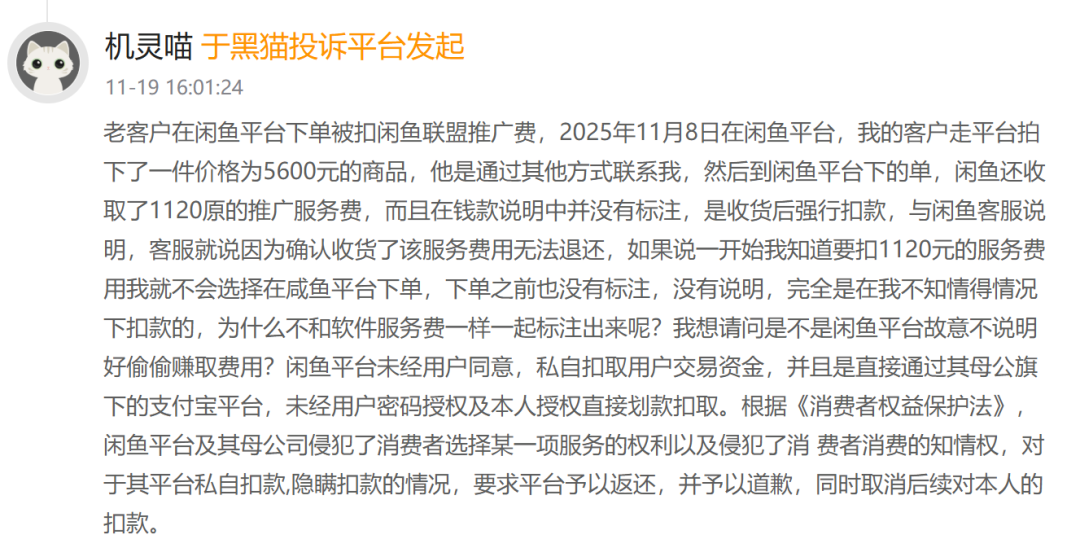 就在上个月,11月8日就有用户在黑猫投诉反映,其客户在闲鱼平台下单购买价格为5600元的商品,闲鱼平台未经同意就收取了1120元的推广服务费。