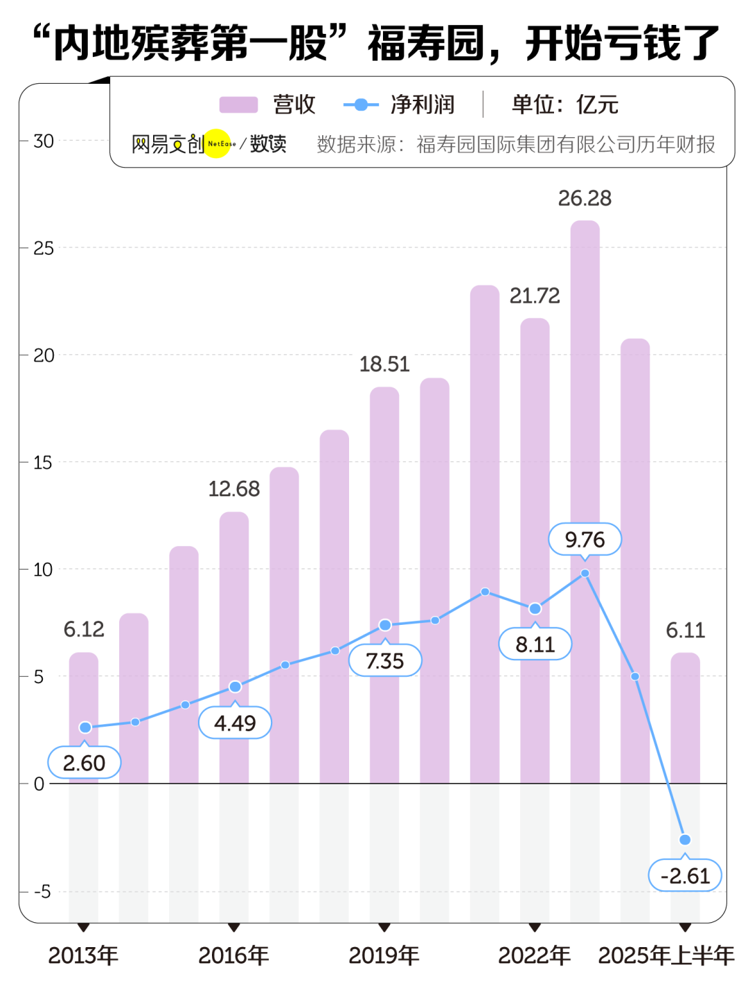 但从那之后,福寿园的业绩就急转直下,2024 年营收下滑,2025 上半年营收同比继续减少约 44.5%,净亏损 2.61 亿元,成为上市以来的首次亏损。