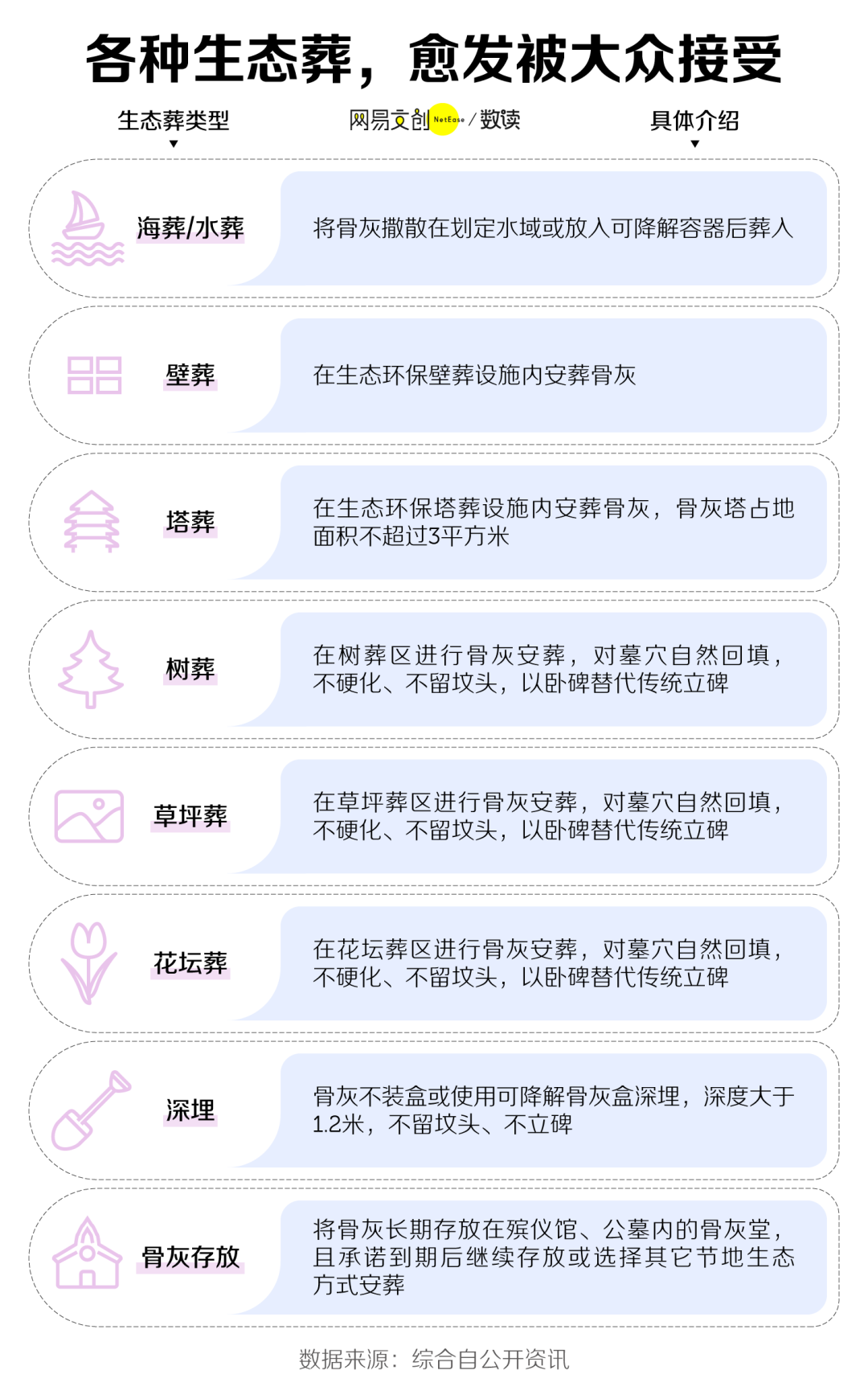 越来越多人开始选择不占用过多土地、生态环保的节地生态葬。有的把骨灰“上墙”,存放在骨灰堂,还有的选择海葬、树葬等生态葬式,把骨灰撒向大海,或放进可降解容器后,埋在树木、花坛下。