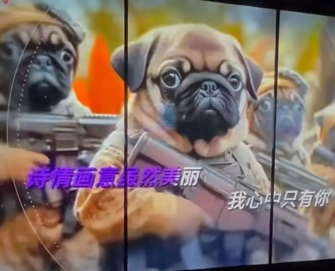 有人点了一首邓丽君的《又见炊烟》,屏幕上出现的是一队端着枪的狗狗。
