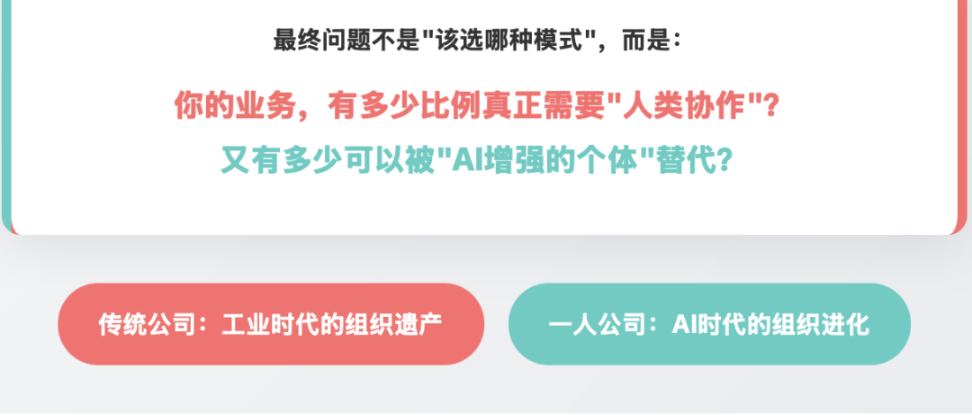 这也是为什么我们说,一人公司更像一种"阶段性最优解",而非终局形态。