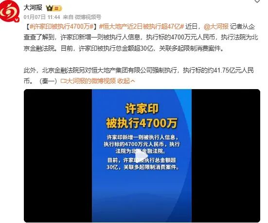 这次的关键词,是“被执行人”。1月5日,北京金融法院接连甩出两条执行公告。一条剑指许家印个人,执行标的4700万元。另一条瞄准恒大地产,执行金额高达41.75亿元。这对许家印而言,只是又一笔被摆上台面的“欠债”,而对无数被卷入这场危机的普通人来说,这更像一声提醒:那些悬而未决的梦魇,还在继续。很多人不知道这4700万和41.75亿究竟是什么?其实并非新的债务纠纷,而是旧罪的清算。早在2025年10月,证监会就已对恒大地产债券欺诈发行案作出处罚:恒大地产因2019至2020年提前确认收入虚增利润、欺诈发行债券,被罚款41.75亿元;作为时任董事长和实际控制人,许家印被顶格罚款4700万元,同时被采取终身证券市场禁入措施。实际上这也并非许家印首次成为被执行人。截至目前,他的被执行总金额已超30亿元,关联多起限制消费案件。按照限制消费规定,他不能乘坐飞机、列车软卧,不能在星级酒店高消费,不能让子女就读高收费私立学校,昔日的地产大亨,早已被牢牢钉在“失信被执行人”的名单上。但比起许家印个人的处境,更让人揪心的是这串数字背后的债务黑洞。4700万加41.75亿,看似庞大,却只是恒大债务冰山的一角。回溯到2022年末,恒大集团资产总额1.84万亿元,负债总额却高达2.44万亿元,资不抵债的缺口清晰可见。2025年8月,恒大被港交所强制退市,成为其危机的重要节点,但退市没有终结任何问题。截至2025年7月31日,清盘人已收到187份债权证明表,债权总额约3500亿港元。这些债权人里,有金融机构,有供应商,更有无数普通的购房者和散户投资者。对散户而言,恒大退市意味着手中的股票变成了废纸,多年的积蓄血本无归。对购房者来说,痛苦则更加漫长。恒大在280多个城市布局了约1300个开发项目,物业管理服务覆盖3000个项目,债务危机爆发后,大量项目停工烂尾,无数家庭的“安居梦”瞬间破碎。好在各地政府并未袖手旁观。多地政府推进恒大项目的保交楼工作。但并非所有项目都能如此幸运,部分项目因债务结构复杂、资金缺口巨大,交付进度依旧缓慢,还有很多业主仍在漫长的等待中煎熬。值得注意的是,在这场危机中,有人被抓,有人被罚款,许家印本人也已被采取强制措施,但还有一些关键人物,仍在“逍遥法外”,比如恒大前总裁夏海钧,还有许家印的前妻丁玉梅。2025年3月,恒大清盘人已将丁玉梅、夏海钧等7人列为被告,起诉他们在管理恒大期间涉嫌违反责任,追讨约60亿美元的不当股息与酬金。针对夏海钧的全球玛瑞瓦禁令更是让其资产无处遁形——香港上诉法庭驳回了他的上诉,维持冻结其600亿港元资产的禁令,禁止他转移资产或处置房产收益。调查显示,夏海钧早已藏身美国加州,与妻儿同住,其妻子名下持有多处房产、汽车和信托资产,总价值高达2400万美元,而这些资产被认定为夏海钧所持有。即便他远遁海外,试图隐匿资产,也终究逃不过法律的追踪。现在回头看,恒大的崩塌,本质上是高杠杆扩张模式的必然结果,更是对市场规则和法律底线的漠视。潮水退去,才知道谁在裸泳。恒大的裸泳者们,正在为自己的行为付出代价。而这场清算,终将让市场回归理性,让规则得到尊重,这或许就是恒大危机留给我们最珍贵的启示。