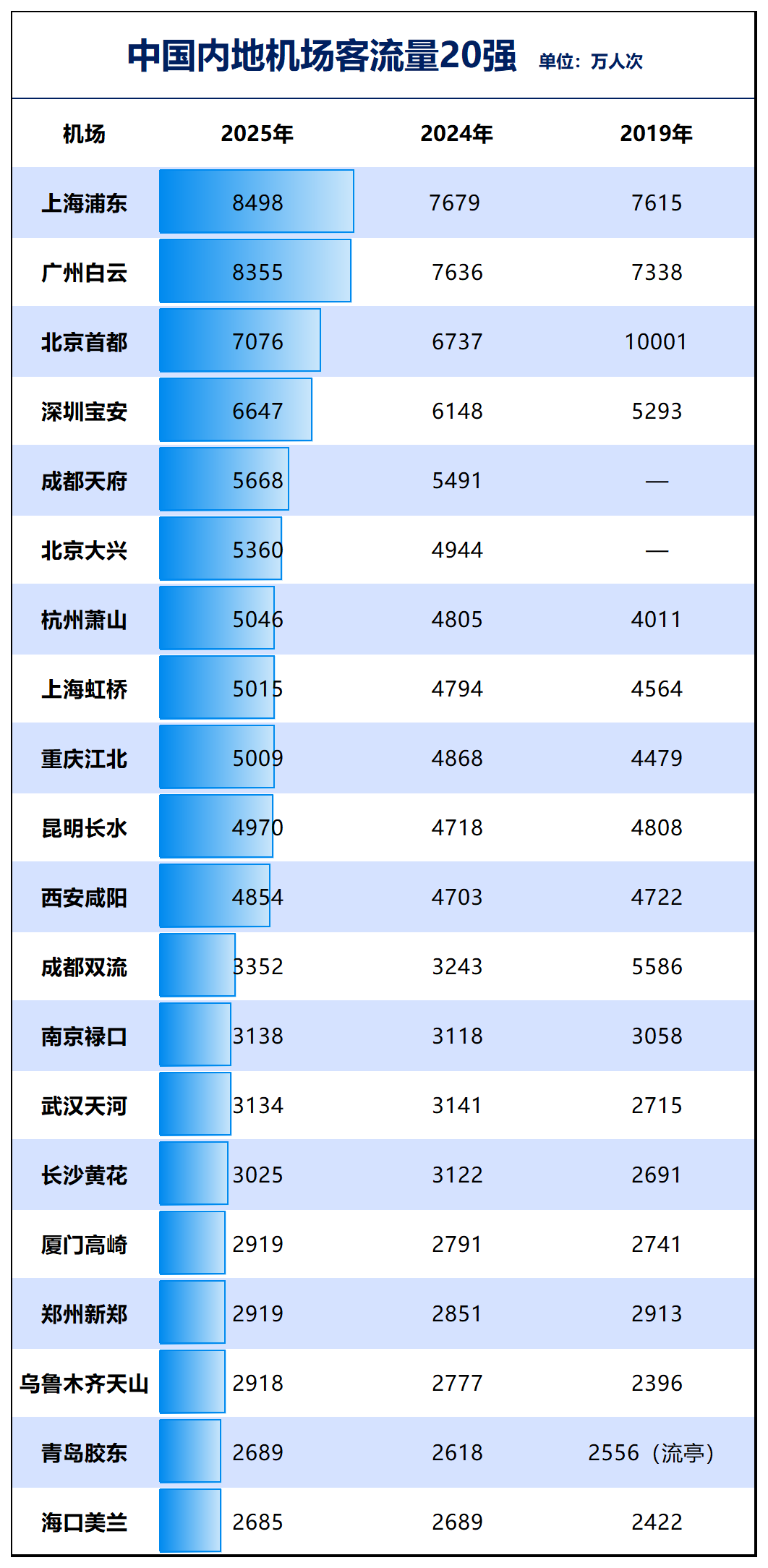 第一,机场客流量位居前十的机场分别是上海浦东、广州白云、北京首都、深圳宝安、成都天府、北京大兴、杭州萧山、上海虹桥、重庆江北、昆明长水。北京是整个华北的门户,上海是华东的门户,广州是整个华南的门户,武汉是中部的门户,成都是西南门户,西安是西北门户。第三,2025年各大机场数据中,最大的亮点,莫过于上海浦东国际机场、广州白云国际机场双双登上8000万人次台阶。2019年北京首都国际机场曾创下过10001万人次的历史纪录。但当年北京大兴国际机场开通,开始分流首都国际机场,同时叠加之后的疫情影响,2020年全国所有机场的客流量都腰斩。直到2025年,终于迎来了新突破,上海浦东、广州白云均创下历史新高,跻身全球十大机场行列,成为中国机场流量的顶流。北京首都国际机场在分流之后,也于2025年重新登上了7000万人次。当然,北京首都机场若没有大兴机场的分流,会是巨无霸级别的存在。上海浦东与广州白云两大顶流机场背后,是其超高的定位与背靠的广阔腹地。从官方定位来看,北京、上海、广州独一档,是超级门户的存在。从国际航线开通数量来看,全国有四个城市的国际航线数量超过100,北京、上海、香港、广州。内地城市中,北上广依旧是无敌存在。西南地区国际航线数量最多的是成都,西北地区最多的是西安。当然,同样突破自身纪录、创下新高的,还有深圳宝安国际机场、成都天府国际机场。前者客流量达到了6647万人次,后者达到了5668万人次。02