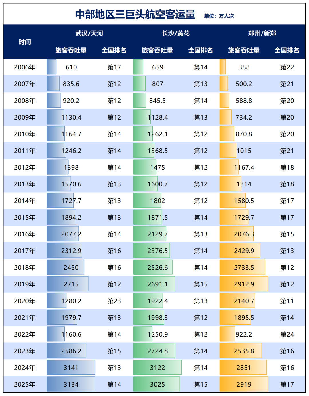 而当时也处在鼎盛客运量时期的武汉、南京、长沙、郑州分别是2715万人次、3018万人次、2691万人次、2913万人次,与头部相比相差了好几个段位。