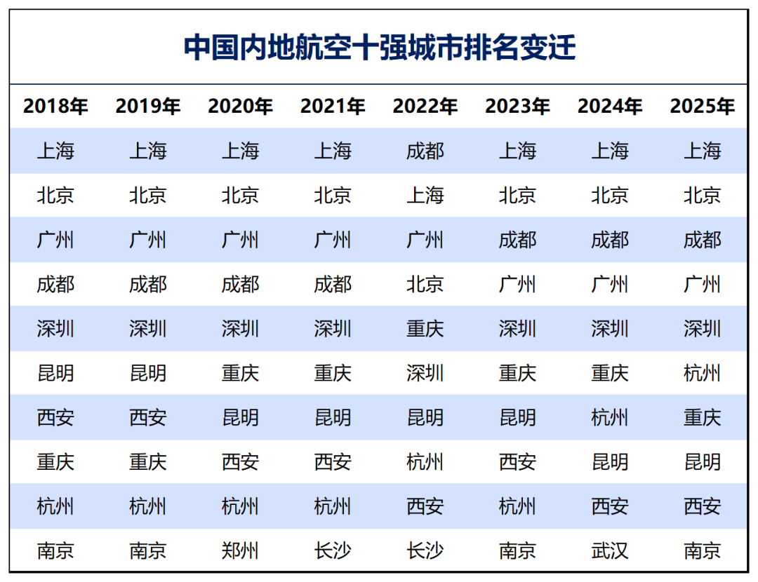 但郑州追赶速度很快,2015年基本追齐了武汉和长沙,2017年实现了对武汉和长沙的反超,到2019年郑州的航空客运量较武汉、长沙均多出200万人次左右。2012年11月17日,中华人民共和国国务院批准《中原经济区规划》,提出以郑州航空港为主体,以综合保税区和关联产业园区为载体,以综合交通枢纽为依托,以发展航空货运为突破口,建设郑州航空港经济综合实验区。2013年,国务院正式批复《郑州航空港经济综合实验区发展规划(2013-2025年)》,郑州由此成为当时全国首个航空港经济区。之后北京、青岛、重庆、广州、上海、成都、长沙、贵阳、杭州、宁波、西安、南京、长春、南宁、福州等城市才陆续批复。而且,直到目前,郑州航空港经济综合实验区依旧是全国面积最大的国家级临空经济示范区。要打造成一个集航空、高铁、地铁、城铁、普铁、高速公路与快速路等多种交通方式的立体综合交通枢纽。并以国际航空物流中心、以航空经济为引领的现代产业基地、内陆地区对外开放重要门户、现代航空都市、中原经济区核心增长极。正是这样一份文件,让郑州的航空实力大增,从上面的数据图可以看到,郑州的航空旅客吞吐量在2013年之后迎来了大爆发,基本每年增加200万-300万人次的运输能力。过去的十年,郑州的地位不断被提升,各种利好文件给到,郑州的经济和产业也迎来了黄金发展的十年。然而时移世易,郑州的航空旅客吞吐量已经告别了黄金时代,现在增长相当缓慢。以单个机场来论,上海浦东第一,广州白云第二,北京首都第三。若以城市而论,广州则掉出了前三,航空前三名被拥有双机场的上海、北京、成都包揽。2025年上海浦东与虹桥双机场合计客流量高达1.35亿人次,位居全国第一,妥妥的中国航空第一城。北京首都与大兴双机场合计客流量也有1.24亿人次。成都天府与双流双机场的总客流量首次突破9000万人次,位居全国第三。航空十强最大的变动,就是南京超越武汉、长沙,这是继2018年之后,南京再次挤入全国航空前十。不过,客观来看,南京以及武汉、长沙、郑州的客流量都不够强。相较于头部城市,仍差了一大截。
