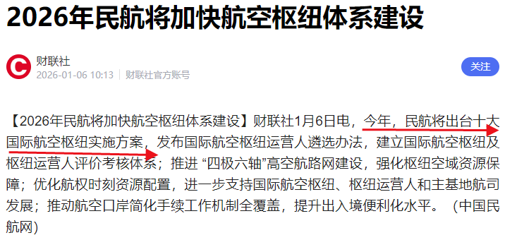 力争到2050年,建成一批世界一流的航空企业和世界一流的航空枢纽,国际航空枢纽功能体系进一步完善,支撑我国建设保障有力、人民满意、竞争一流的交通强国。强化北京、上海、广州三大枢纽机场的洲际连接能力和全球辐射能力,打造全方位门户复合型国际航空枢纽,加快成都、深圳、昆明、西安、重庆、乌鲁木齐、哈尔滨等区域复合型门户航空枢纽建设,强化一批区域航空枢纽面向特定区域的国际功能,稳步推进鄂州等专业性航空货运枢纽和郑州等综合性航空货运枢纽建设。2026年1月6日召开的全国民航工作会议上,再次强调了这一点: