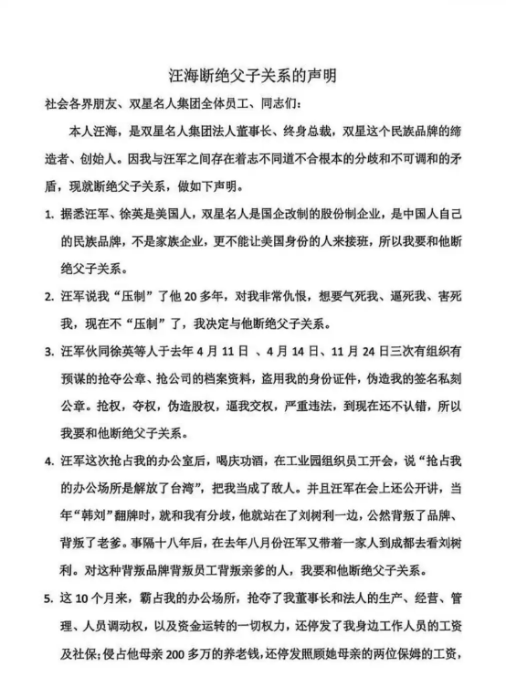84岁的创始人汪海,亲手写下一纸声明,宣布和儿子汪军、儿媳徐英彻底断绝关系。