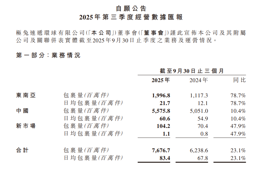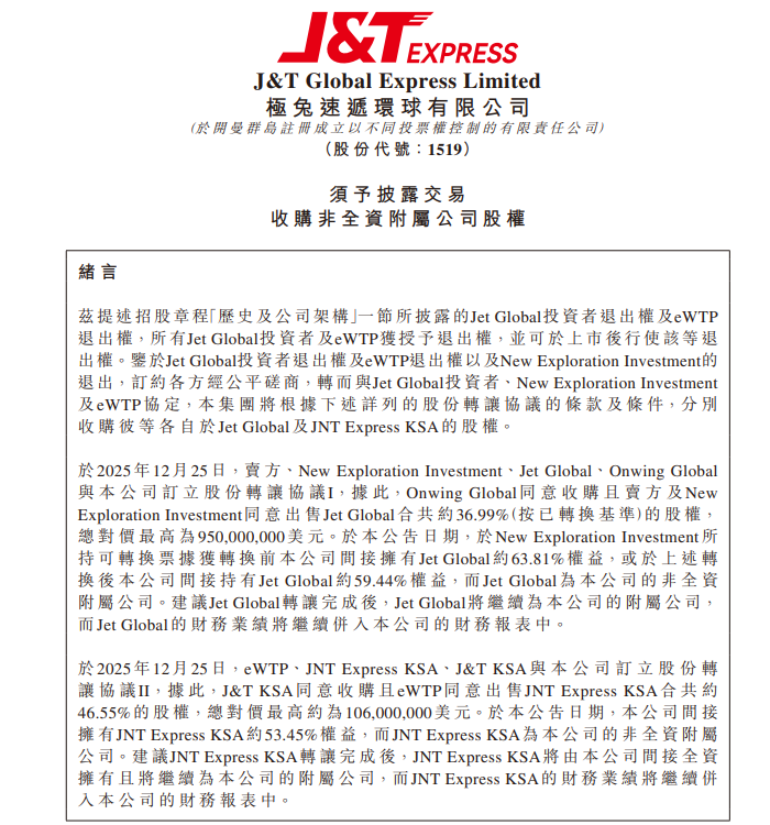 元旦前夕,极兔公布了两项关键操作,令电商行业瞩目。极兔先是在12月28日,披露获得了2笔新融资,一笔为最高20亿元人民币,期限12个月;另一笔为最高15亿元人民币,期限36个月。而这35亿元还没捂暖,就被极兔悉数花去。极兔称要以最高10.56亿美元回购两家附属公司少数股权,这两家被回购公司一家叫Jet Globa,一家叫JNT Express KSA,总对价最高分别达9.5亿美元、1.06亿美元,折合人民币共73.85亿元,已经是融资的两倍。总得来说,这次大手笔交易,极兔买的其实是自家流落在外的“左膀右臂”。Jet Global是极兔在新兴市场(巴西、墨西哥、阿拉伯、沙特)的实体运营公司。此前,极兔已间接持有64%的权益,而此次收回剩余的股权,极兔想要的是将这一关键的物流基础设施与技术资产管理平台,完全纳入自己的体系。极兔的全球化事业正如火如荼,Jet Global往往扮演着统筹物流设备采购、输出统一技术标准以及管理核心资产的角色,它可以让跨国快递网络得以高效运转。另一家标的JNT Express KSA,其实是极兔的沙特公司,是极兔中东战役的桥头堡。此前极兔持有53%的股份,更多是一种利用合作伙伴资源快速起网的合资模式。此次回购股份,说明极兔在中东的业务已取得不错进展。据悉,沙特不仅是极兔在新兴市场中增长最快的区域,也是客单价最高的区域之一。回购后,JNT Express KSA的利润就可以并入极兔的财报。对于这笔资本运作,极兔官方给出的理由相当克制,仅表示是为了优化资本结构并为长远发展铺路。但从业务和协同作用来看,这还意味着极兔从资产到管理的全面收权,其要在全球建立统一的技术标准体系,实现指令的一竿子插到底。值得注意的是,拿到钱后的极兔并不打算停下脚步,新到手的贷款还计划在中东与拉美市场的基建上投入。其中重点的国家主要是沙特、墨西哥和巴西。借此覆盖更多的末端网点,升级转运中心的自动化,以往依靠租赁或外包的节点,可能会逐渐被自建的现代化枢纽取代,如此在业务高峰期,运力不会因合作伙伴的效率瓶颈而瘫痪。同时,本土化运营也是核心支出项,确保其在对抗国际物流巨头时,依然保持履约的稳定性。对于依靠跨境履约的商家而言,极兔这次真金白银的投入,最直接的就是发往中东等核心市场的包裹,效率将会得到提高,丢件率和破损率也有望因为技术标准的统一而减少。不过更关键的还是运力保障得以稳定,如果极兔顺利在新兴市场构建自有转运与干线网络,对于商家来说更有安全感。20万商家已加派代社群,可选「TikTok 、Temu、淘系、抖音、拼多多、小红书」等。关注「派代跨境」,免费进群↓极兔目前的业务版图,呈现出国内外双修的棋局。它用十年的时间,在13个国家构建了物流网络,形成东南亚、中国、新兴市场三大板块。极兔的财报显示,2025年前三季度,总体实现包裹量约76.8亿件,同比增长23.1%;日均包裹量8340万件,各主要市场均实现双位数增长,其中东南亚及新市场增长尤为迅猛。作为核心基本盘的东南亚,其总包裹量近20亿件,同比增长78.7%,网点数量达到10700个。而中国市场前三季的包裹量为55.8亿件,同比增长10.4%,日均包裹量6060万件。新市场方面(包括沙特阿拉伯、阿联酋、墨西哥、巴西及埃及),包裹量为1.04亿件,同比上升47.9%,日均包裹量为113万件。目前,极兔的全球战略逻辑是,以东南亚的高利润反哺中国市场的规模扩张,同时打开新兴市场的业务空间。在国内的跨境物流竞争中,极兔面临的处境颇为复杂。国内快递行业已告别高增长时代,极兔依赖价格优势换取规模的边际效应在递减,同时监管趋严与行业共识的转变,极兔还要解决单票收入偏低和服务质量欠佳的难题。更严峻的挑战在于,菜鸟、京东物流等竞争对手背靠强大的生态,通过仓配一体化深度绑定了跨境商家。极兔作为独立第三方物流,在缺乏自有商流支撑的情况下,必须证明其在跨境链路上的稳定履约能力,才能在跨境电商件的争夺中抢占一席之地,这或许也是极兔愿意花费70多亿元也要回购2家公司的原因。在国际跨境物流方面,极兔将战略重心锁定在沙特、阿联酋、巴西及墨西哥等新兴市场。借助中国跨境电商平台出海的东风,极兔迅速完成起网,并取得了显著的市场份额。极兔之所以能迅速起网,主要得益于与当地伙伴合资或代理的模式,但这种模式也存在高峰期运力调配不灵活、服务标准执行不到位的毛病,这将制约极兔承接高端商流。同时,电商平台自建物流趋势加速,Shopee提升自配送占比,亚马逊收购巴西快递公司股份,极兔需在巨头夹缝中寻找差异化空间。这样看来,2025年的日历翻到底,极兔手里的钱不再是数字,而是燃料。资本重组后,极兔可以把在国内跑通的打法,原样复刻到全球市场。比如,把国内 270 套自动化分拣设备的运营经验,打包输出到那些新兴市场。或者是借着包机航线的优势,把跨境干线和本地派送网络串成一张网。但说到底,这步棋能不能走活,关键还是看极兔能不能把钱变成实打实的服务壁垒,而不是重走过去价格战的老路。对极兔来说,花70多亿元提升跨境物流业务能力,其实是一件性价比很高的事。价格战的路已经走不通了,国内那点存量市场其实是个只赚吆喝不赚钱的绞肉机。未来极兔真正的机遇在于,Temu、Shein、TikTok、速卖通等电商平台,在海外攻城略地,缺的不是货,是能把货送到巴西贫民窟、送到沙特沙漠里的物流能力。
