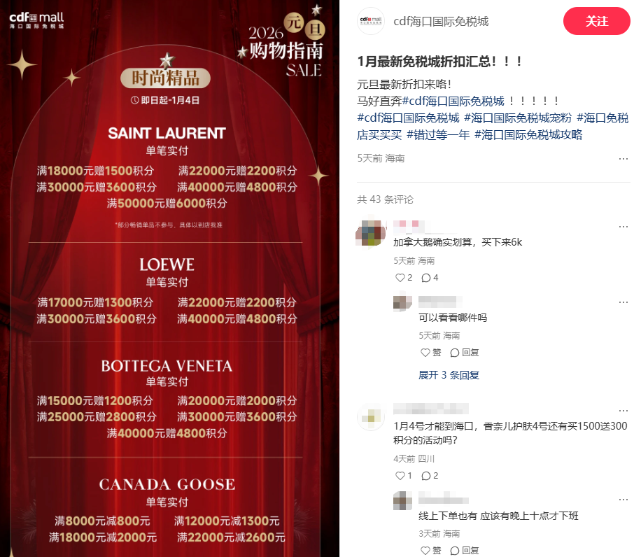 比如近期,cdf海口国际税城推出“时尚精品”促销活动,包括圣劳伦、罗意威、葆蝶家、加拿大鹅在内的多个品牌在免税的基础上推出消费满额赠送积分、满8000元减800元、满12000元减1300元等优惠活动。
