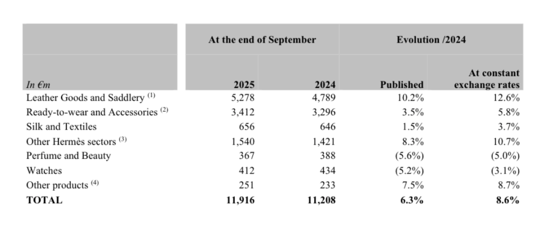 2025年前三季度,爱马仕的皮具及马具线收入52.78亿欧元,相比2024年增长了10.2%,相比之下,成衣及饰品线收入34.12亿欧元,仅增长3.5%;丝绸及纺织品收入6.56亿欧元,微增1.5%。另外,被寄予厚望的香水及美妆线、钟表线,均有超过5%的下滑。