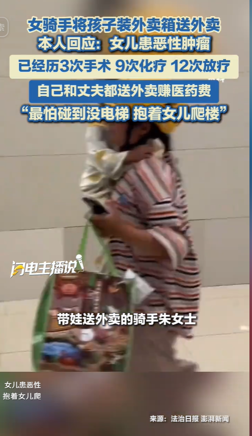 孩子患上了恶性肿瘤,要钱治病,夫妻俩都在跑外卖。家中无人照料,只能带在身边。孩子要抱,送订单总是超时。最怕遇到没有电梯,要抱着孩子跑上跑下......想想就知道有多难。