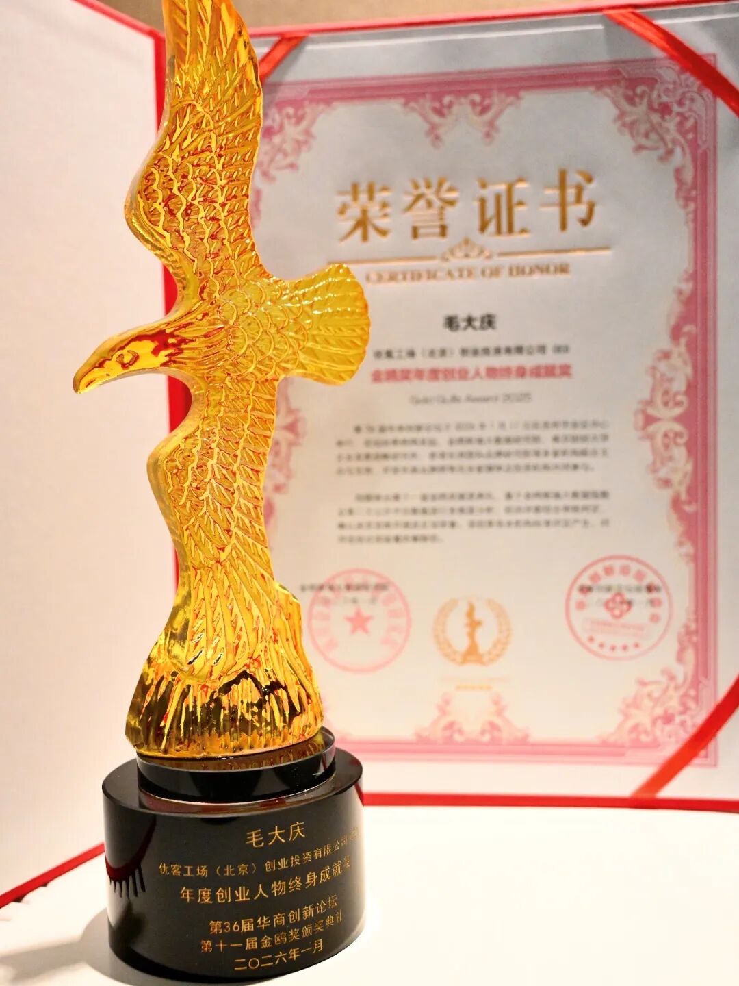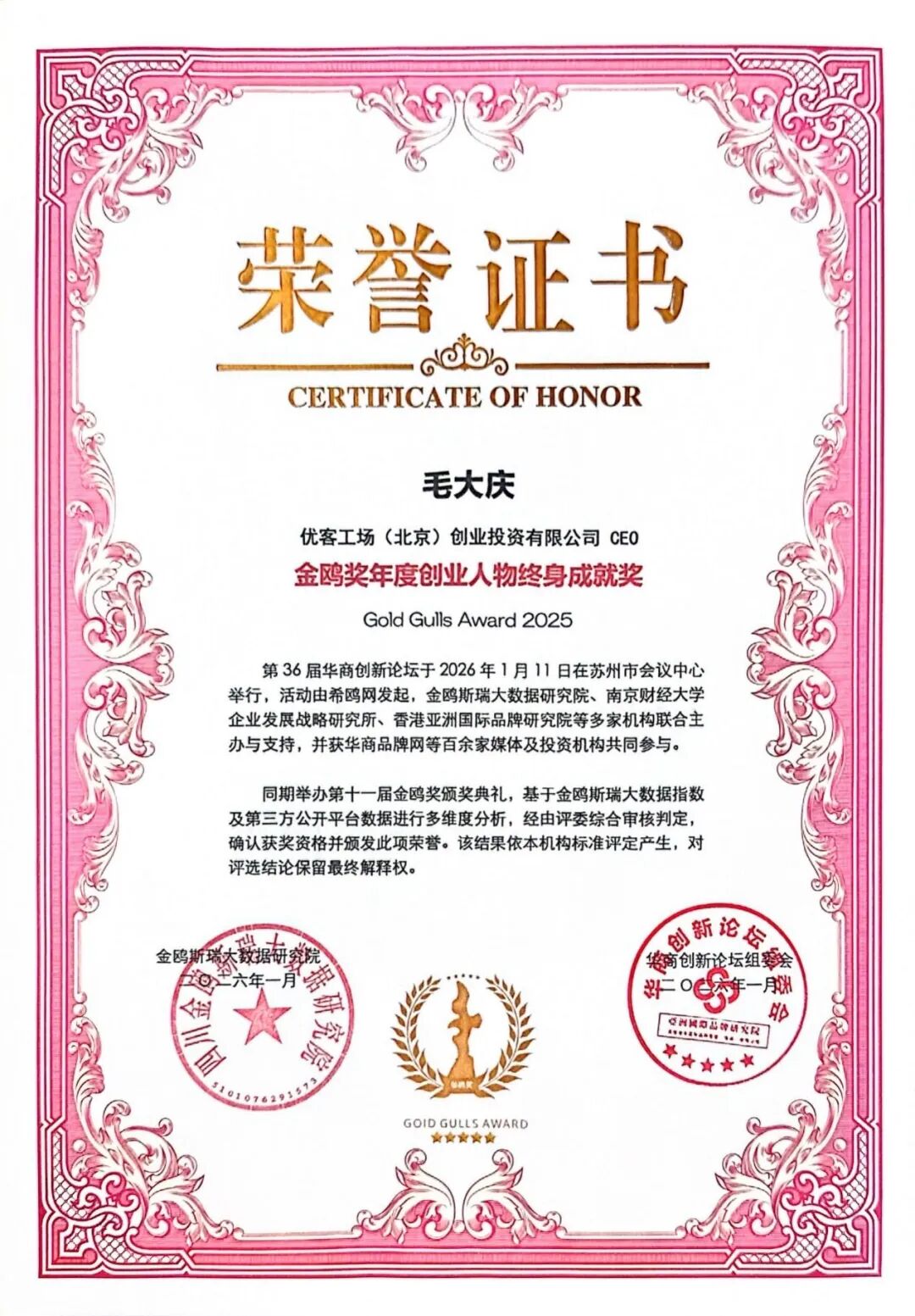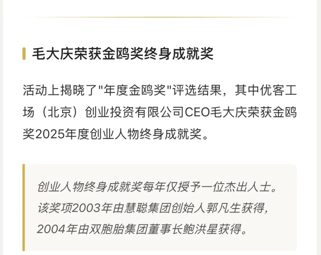 毛大庆荣获金鸥奖2025年度创业人物终身成就奖