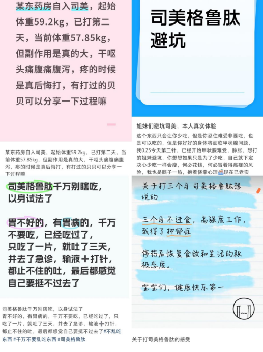 “减肥神药”降价,消费者固然受益,但也要警惕背后的“滥用”风险。在社交媒体上,大家一面惊叹于“减肥”效率,一面吐着苦水:头晕、呕吐、腹泻、低血糖症状、消化系统失灵......还有人直接被司美格鲁肽勾出了体内的并发症。