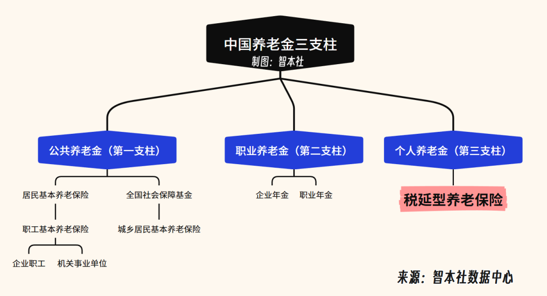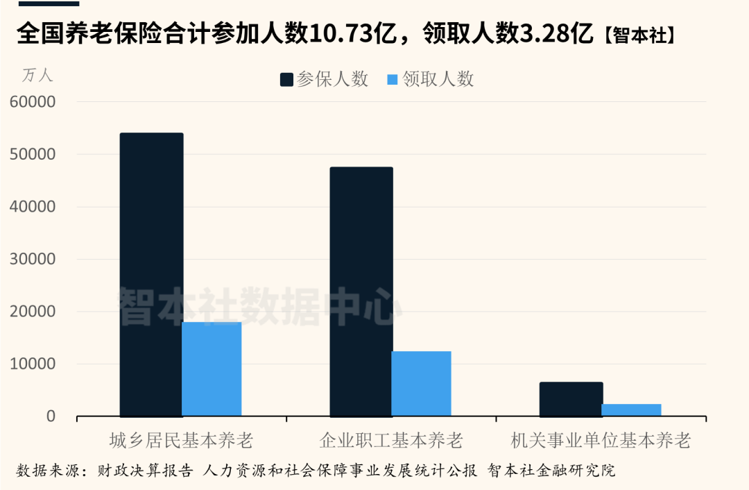 先来看基础养老体系的整体收支,2024年,全国基本养老保险基金总收入为8.19万亿元,总支出为7.28万亿元,账面结余0.81万亿元。然而,这一表观盈余包含1.93万亿元的财政补贴,占总收入的23.6%。若仅考察保费收入(即用人单位与个人实际缴纳部分),2024年收入为5.87万亿元,自然缺口达1.41万亿元。这意味着,若无财政转移支付,当年基金已无法实现当期平衡。15年来增长15倍,近六年年均增速约为7.8%,显著高于一般公共预算收入增速。补贴占全国一般公共预算支出的比重已超过10%。全国基本养老保险正从“现收现付+部分积累”的混合模式,实质性滑向以财政兜底为主的转移支付机制。如图所示,在养老制度构成上,中国养老体系遵循世界银行在1994年总结各国经验并提出的三支柱方案,由公共基本养老保险、补充职业养老保险和个人养老金三支柱构成。第一支柱基本养老保险,主要包括城镇职工基本养老保险以及城乡居民基本养老保险两个部分,为老年人收入起到兜底作用。第二支柱补充养老保险,主要包括企业年金和职业年金,为老年人收入起到增厚作用。第三支柱养老保险,主要指个人单独缴纳的养老金,也就是这几年政策(银行)在推动的税延型养老保险。第三支柱个人税延型养老保险近些年来政策不断推进,但发展目前尚在初期(如上图),目前规模仅有300亿人民币,在三支柱中的占比仅为0.2%;第二支柱的职业年金主要覆盖机关事业单位工作人员,企业年金则长期以国企、央企、大型金融机构为主,另外还包含部分大型集团公司一部分群体,这也是过去一直被诟病“体制内专属福利”的原因,目前总规模5.71万亿元。近年来,政策正推动其向更广泛市场主体扩展。第一支柱,基本养老保险,目前覆盖超10亿人,基金累计结余7.8万亿元,约占总规模的57.6%。(要注意的是,由于财政补贴的存在,这个占比远远低估了第一支柱的重要性,实际占比远高于这个数字)可以说是绝大多数中国人养老保障的唯一来源,故本篇报告的数据也主要集中在第一支柱。中国国基本养老保险名义统一,实则由三个相对独立的子系统基金构成:分为企业职工基本养老保险、城乡居民基本养老保险、机关事业单位基本养老保险、而三者在筹资机制、财政依赖度及待遇水平上存在显著差异。根据智本社数据中心的统计,截至2024年底,全国基本养老保险参保人数为10.73亿人(新增639万人)。其中:城乡居民参保5.38亿人(减少693万人),领取待遇者1.80亿人(新增1902万);企业职工参保4.73亿人(新增1214万),领取待遇者约1.24亿人(新增444万);机关事业单位参保0.62亿人(新增118万),领取待遇者0.23亿人(新增99万)。机关事业单位退休人员月均养老金为6,364元;企业职工为...